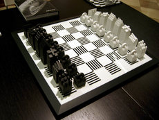 Pezzi in Porcellana Rosenthal bianca e nera; scacchiera firmata dall'artista, in plexiglass bordato - Chess pieces in Black and White Rosenthal Porcelain; chess board signed by the artist, plexiglass and wood.